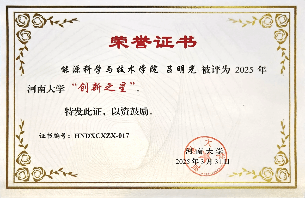 2021级化学工程与工艺专业学生吕明光获评2025年河南大学“创新之星”荣誉称号。