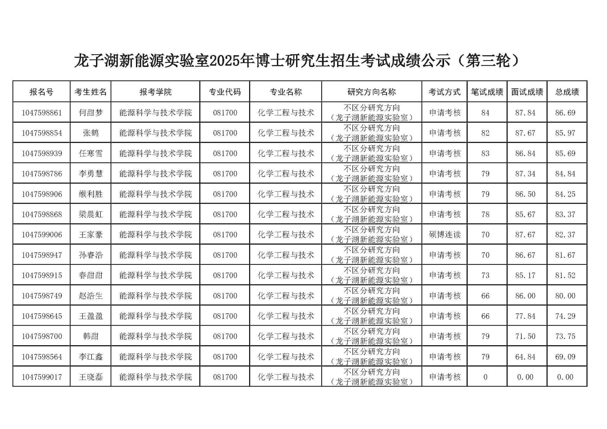 龙子湖新能源实验室2025年博士研究生招生考试成绩公示(第二轮)