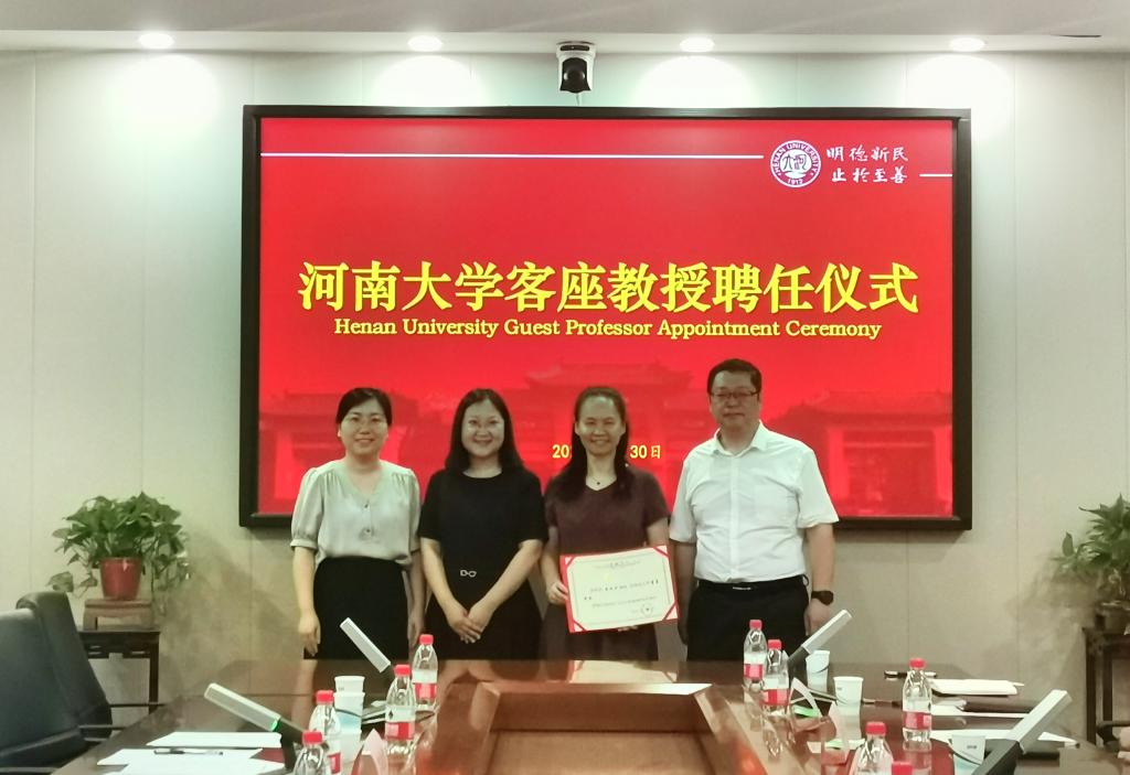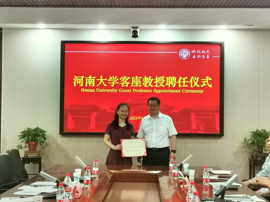 执行院长李谦为吉晓燕教授颁发客座教授聘书并致辞,他对吉晓燕教授加盟河南大学表示欢迎。李谦介绍了学院筹划、建立以及未来发展方向和定位,希望吉晓燕教授加强对即时足球