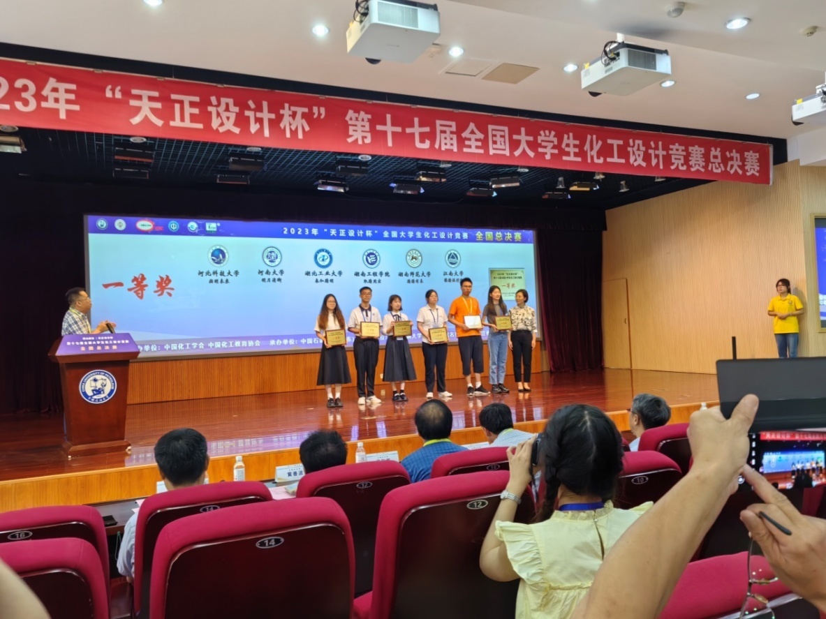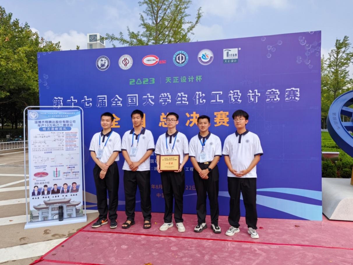 2023年8月19日至8月22日在中国石油大学(华东)举办的第十七届全国大学生化工设计竞赛全国总决赛中,我校由候永康、郑浩圆、何航、王鑫果、陈舣安等五名学生组成的“明月清晰”团队荣获全国一等奖。这也是我校在本项竞赛中取得的第五个全国一等奖。