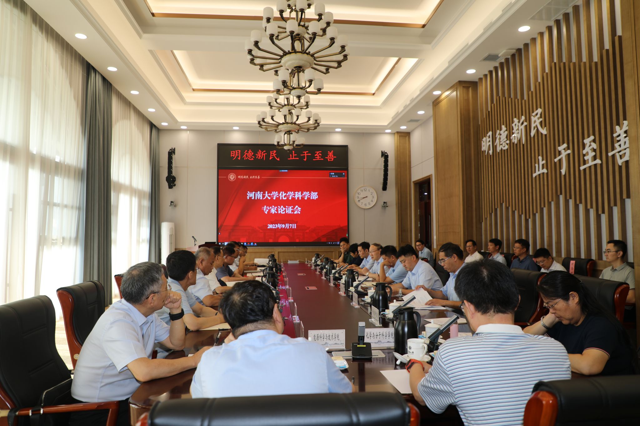 执行院长李谦就河南大学化学科学部建设方案进行汇报。由山东石油化工学院院长、中国石油大学(北京)化学工程与环境学院教授、中国科学院院士徐春明,天津大学原副校长、中国科学院院士元英进,南开大学材料科学与工程学院院长、中国科学院院士卜显和,河南师范大学原校长、中原学者王键吉,山东大学化学学院前任院长、国家杰青郝京诚,浙江大学理学部常务副主任李浩然,南开大学元素有机国家重点实验室主任、国家杰青崔春明,吉林大学研究生院院长、国家杰青孙俊奇,郑州大学化工学院院长周震组成的论证专家组对我校化学科学部建设方案进行论证。专家组对建设方案给予高度肯定,认为河南大学化学学科成绩深厚,已初步建成“学院+研究院+基地”的学科布局,近年来产出了一批高水平标志性成果,具备雄厚的建设基础;成立化学科学部对于进一步优化学科布局、加快加强学科交叉、聚集一流师资、培养一流人才、产出一流成果将起到重要的促进作用;同时重点围绕化学科学部目标定位、组织架构、学科融合、人才队伍和运行机制等方面提出了建设性意见和建议。