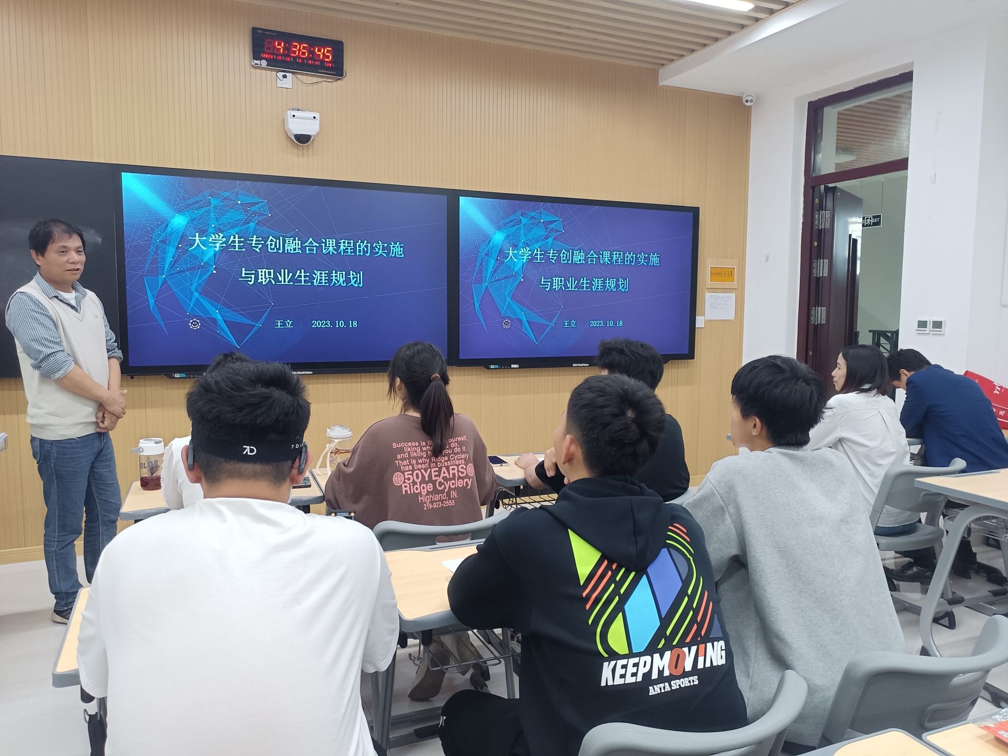 邀请优秀双创导师、河南大学欧亚国际学院王立老师在郑州校区友兰学堂南楼C座315做大学生专创融合课程的实施与职业生涯规划的报告,学院部分教师和2023级学生参会。报告由杨浩老师主持。