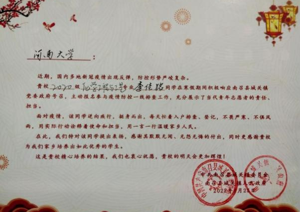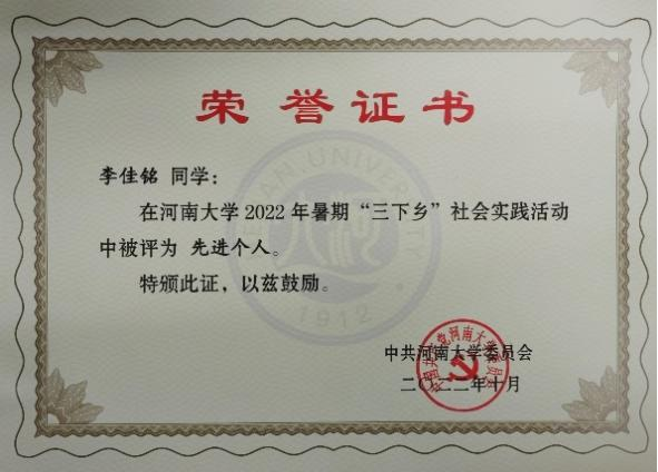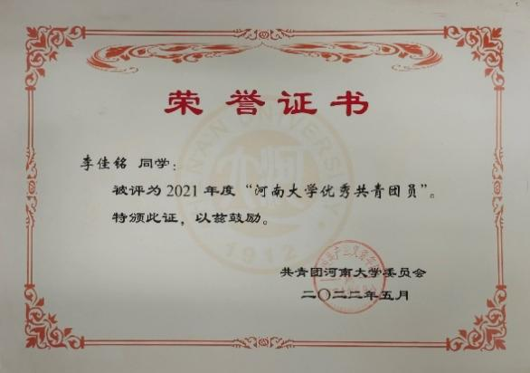 同时,作为一名大学生党员,李佳铭深入学习领会和贯彻落实习近平新时代中国特色社会主义思想、党的二十大精神及习近平总书记系列重要讲话精神。在理论和实践中不断锤炼自己,加强党性修养,坚定理想信念,充分发挥党员的先锋模范作用,获得河南大学优秀共青团员荣誉称号。